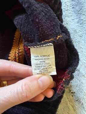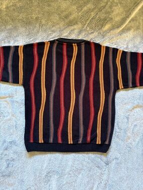 Eclectic grandpa vibes with this black sweater featuring vertical red, gold and muted teal wavy stripes, reminiscent of the retro 80s and 90s Coogi and Cosby style sweaters.