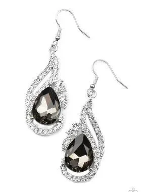 White rhinestone encrusted silver bars delicately whirl around an oversized smoky teardrop gem, creating a smoldering lure. Earring attaches to a standard fishhook fitting.