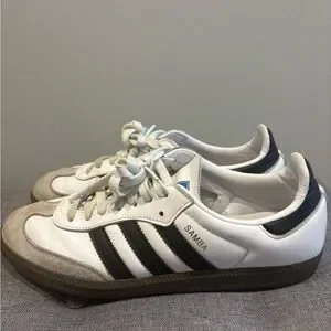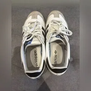 There’s some light scuffing on the shoes and leather cracks on the left heel.