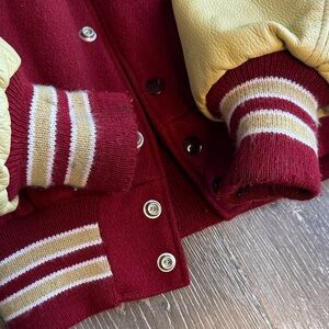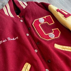 Stylish maroon and yellow varsity jacket with embroidered details. Perfect for a sporty and casual look.