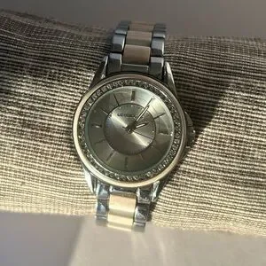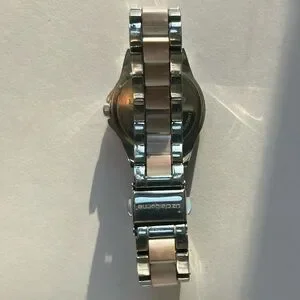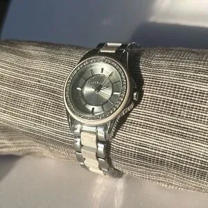 Two tone silver and white women’s watch from Liz Claiborne. The white links are made to looks like natural stone. Featuring a polished silver watch face with understated numerals framed by delicate white border and crystal embellishments.