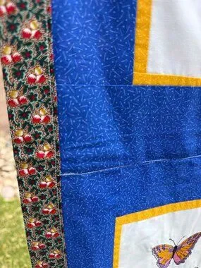 • Hand-embroidered blocks with flowers, butterflies, birds, and nature motifs