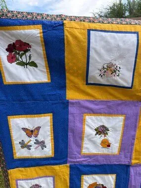 Handmade vintage patchwork quilt featuring embroidered floral and butterfly motif blocks arranged in a grid design.