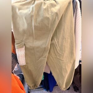 Olive-green boot-cut jumpsuit with distressed cargo details. Crochet pocket and trim add handcrafted texture. Drawstring cords at the waist and hood enhance the casual look. New without tags.