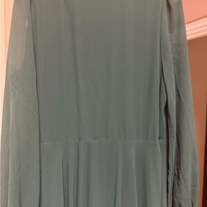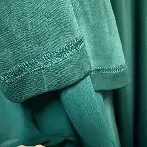 Flowing emerald wrap maxi with a V-neck and long sleeves. Front slit adds movement and a touch of drama. Soft drape flatters the waist and skims the figure. Elegant option for evening events and special occasions. Worn once