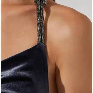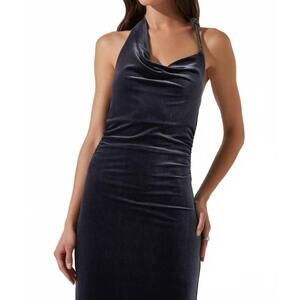 Unveil elegance with the Eugenia Dress by ASTR, a perfect choice for evening events in a striking grey blue. This sleeveless bodycon midi dress features a luxurious velvet composition, with a sultry cowl neckline and a unique rhinestone knot detail on the halter strap. Crafted from a blend of 92% Polyester and 8% Elastane for the shell and lined with 95% Polyester and 5% Elastane, it ensures a sleek fit. Closure: Concealed center back zipper with hook & eye. Enjoy minimalist sophistication for the summer season.