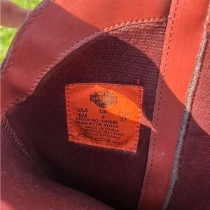 Harley-Davidson boot interior with bright red leather label. Harley-Davidson logo visible on tag. Rich red lining and stitching surround the tag.