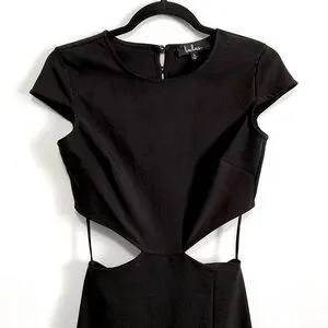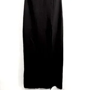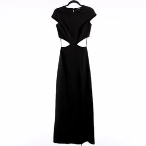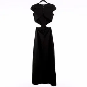 Excellent used condition. Pit to pit 16”, Length from shoulder approximately 60”. Features cap sleeves, fitted stretchy fabric, rounded neckline, a row of buttons and hidden zipper at back for entry, side cutouts, thigh-high front slit and unlined. No materials tag. 95% Polyester & 5% Spandex. Color is black.