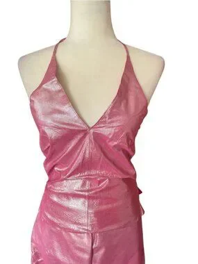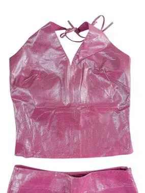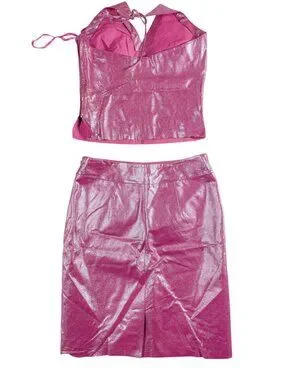 The Ultimate Barbiecore Icon! This 100% genuine leather two-piece set from Express Worldwide is a literal time capsule from the early 2000s. Featuring a sleek halter neck crop top with a flattering open back and a matching high-waisted mini skirt. The leather has a subtle metallic sheen that looks incredible in any light.