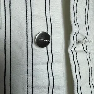 Striped Cloud is a warm, off white base with a navy double stripe detail. It features a silver shank center front closure, front patch pockets, tonal stitching and a clean hem