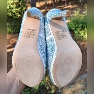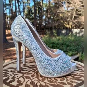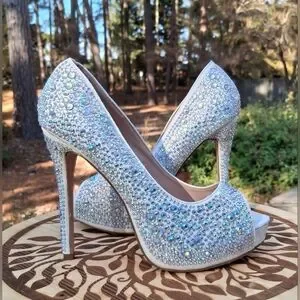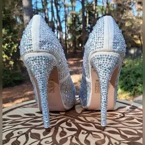 Step out in style with these stunning white stiletto heels adorned with sparkling rhinestones. Perfect for any special occasion. Pre-owned and gently worn once Lauren Lorraine clear rhinestone studded stiletto peep toe heel sandals size 8