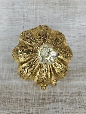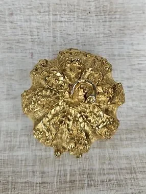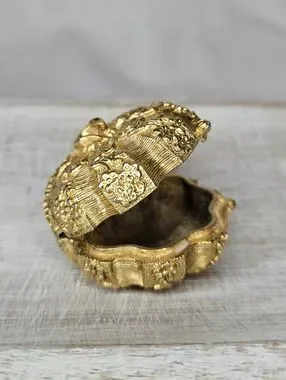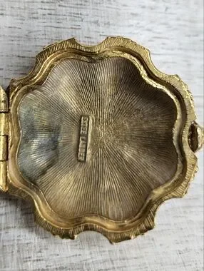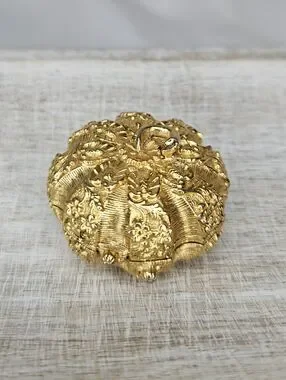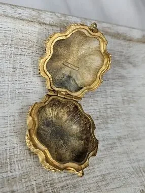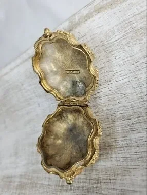 This beautiful vintage 1960s Estée Lauder perfume compact features an ornate gold-tone design with raised floral detailing and textured panels. The hinged case opens to reveal the interior compartment, originally designed to hold solid perfume, making it both a functional piece and a collectible treasure.