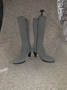 LA CANADIENNE-MAZY-Taupe/Gray Suede-Tall Boots-Side Zip-Studs-Sz 10-Excellent