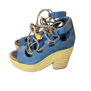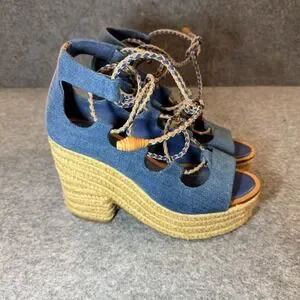 Tory Burch Espadrille Sandals 5.5 Positano Blue Canvas Platform Lace