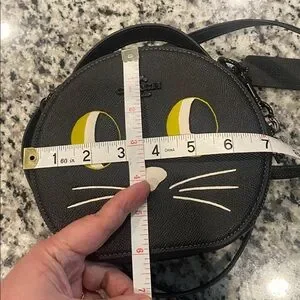 Round Coach crossbody with playful cat face design. Black leather body with bold yellow eye appliqués and cream whisker and nose details. Top handle and detachable strap for versatile wear. Sleek, whimsical statement piece.