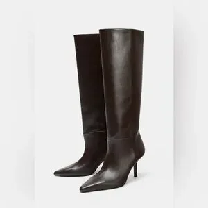 Zara Chocolate Brown Vegan Knee-High Pointed-Toe Boots with Heels. Ruched front. High, slender heel. Easy to slip on. Pointed toe. Heel height: 7.5 cm. Size 6. Ref. 1020/610. Excellent condition. SH27
