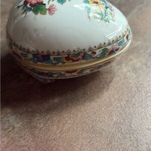 Porcelain egg-shaped trinket box. White base with multicolor floral and gold band accents. Compact decorative piece for display or storage.