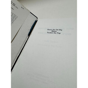 The book features a blue dust jacket with a black and white illustration of an oil rig and two tugboats.
