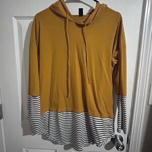 Ribbed mustard tunic with hood and drawstring. Rounded hem with contrasting black and white striped trim. Soft stretch fabric for easy wear. Casual layered styling.