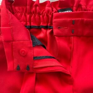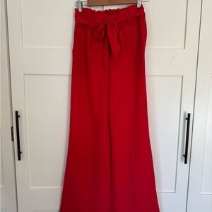 Bright red wide-leg pants from Express. Paperbag waist with a self-tie belt, button enclosures and pockets. Flowing silhouette that elongates the leg. Easy to dress up or down.