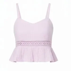Roxy- Soft lilac tank top with delicate crochet trim and a flirty ruffle hem. Lightweight, breathable fabric for all-day comfort. Adjustable spaghetti straps provide a customizable fit. Stylish lilac color adds a feminine touch to any outfit.
