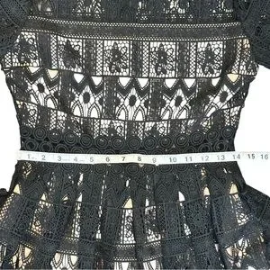 This Alexis Lula Guipure Lace Eyelet Short Sleeve Mini Dress in Black is a Women’s Medium. Perfect for cocktail or semi-formal occasions, this gorgeous dress features a full lining around the skirt and partial lining at the bodice, with a hidden zip at the back. See photos for measurements. In excellent condition.