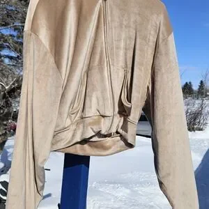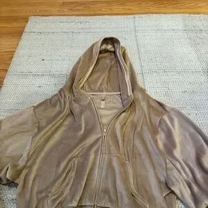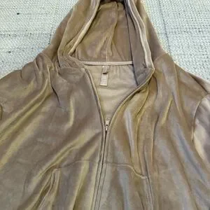 Soft velvet zip-up hoodie in warm tan. Lightweight, cozy fabric with a relaxed fit and hood. Front pockets and full zipper for easy wear. Versatile tan color pairs well with casual outfits.