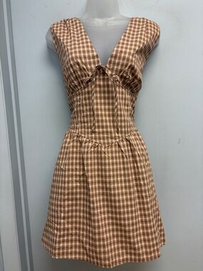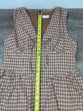 Pink Lily Brown Plaid Cotton Mini Dress Tie Front Cottagecore XL