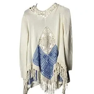 Ruby Moon White & Blue Boho Tribal Bohowestern Crochet Fringe Cardigan