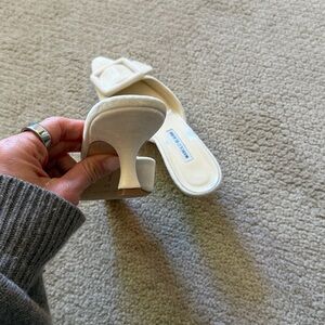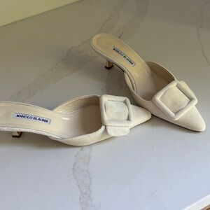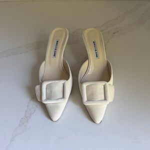 Manolo Blahnik cream suede mules. Pointed toe with a large square buckle. Slip-on style for easy wear. Refined, minimalist design.
