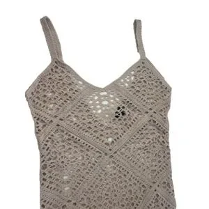 The Nasty Girl Crochet Dress/Coverup is a size L fairycore boho whimsigoth dress in a tan color. It features a sleeveless design with a V-neckline and a pullover closure. Made from acrylic material, this long dress is adorned with crochet and fringe accents, making it perfect for casual occasions in the summer and spring seasons. With a bohemian theme and a hint of nature and art, this maxi slip dress embodies a carefree and stylish aesthetic that is both trendy and unique. this would make a wonderful swimsuit coverup. Pit to pit measurements are 19 1/2 inches. Shoulder to hem "down side seam" measures 50 inches.