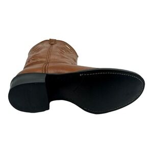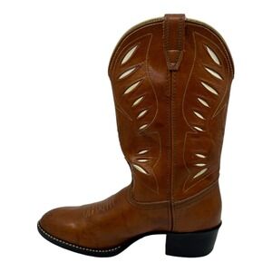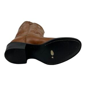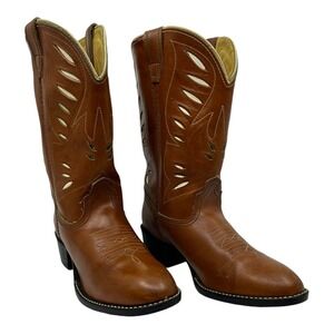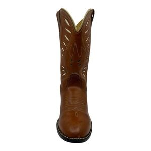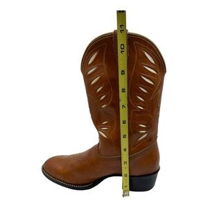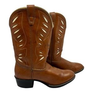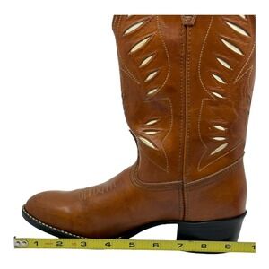 Acme Cowpuncher western boots feature a classic mid-calf silhouette in a rich tan leather. These vintage-inspired boots are detailed with intricate contrast stitching and decorative cut-out overlays along the shaft, creating a striking visual texture. Built with a sturdy block heel and a rounded toe, they offer a traditional cowboy aesthetic with a durable rubber-capped sole. These boots are in good pre-owned condition with minor scuffing on the toes and light wear to the outsoles. Perfect for a country concert, a day at the rodeo, or adding a western edge to your everyday festival attire.