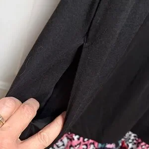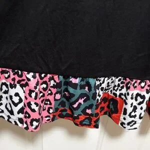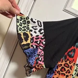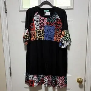Vibrant multi-color leopard panels on a black mini dress with pockets. Soft, flowy fabric with ruffle sleeves for a flattering silhouette. Eye-catching pink, red, blue, green and yellow accents add playful contrast. Easy, comfortable wear for day or night.