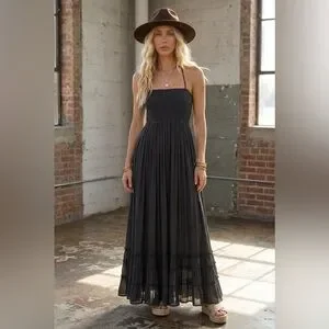 NWT Tiered Boho Smocked Halter Strappy Back Maxi Dress Black