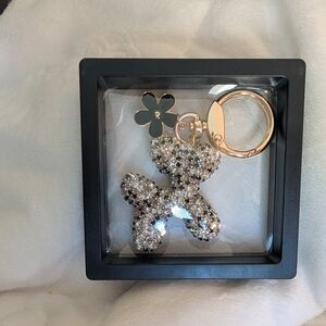 Sparkling Balloon Dog Silver & Black Bag Charm Keychain with Flower Charm
