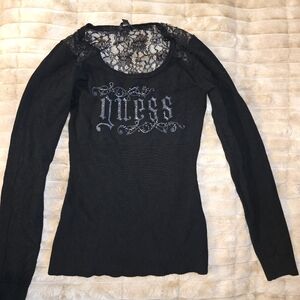 Black long-sleeve top with lace yoke and scoop neckline. Embellished Guess logo with subtle rhinestone accents. Slim, form-fitting silhouette. Elegant layering piece for day or night.