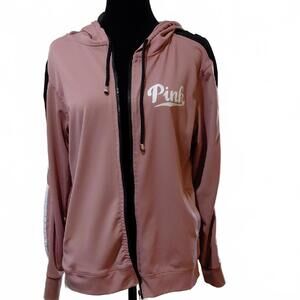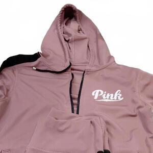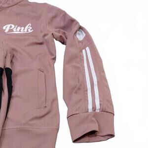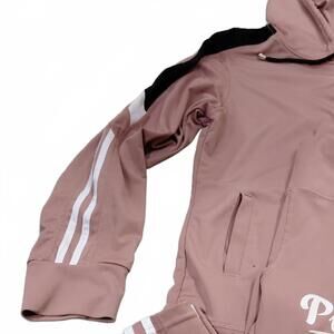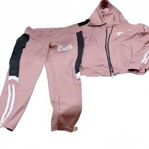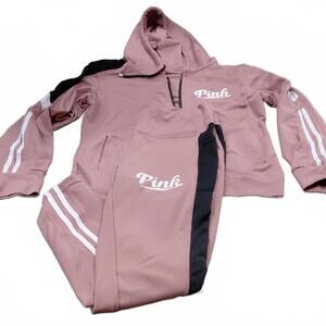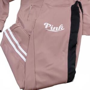 Two-piece PINK by Victoria's Secret set. Mauve pink zip hoodie and matching joggers. Black side panels with white stripe accents. Soft athletic knit fabric. Casual everyday look.