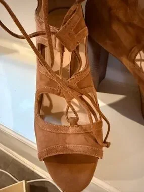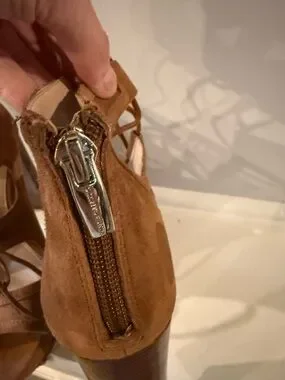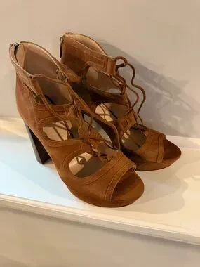 Suede lace-up sandals with bold cutouts. Stacked high heel for added height. Back zipper closure for easy on and off. Open toe design with platform sole.
