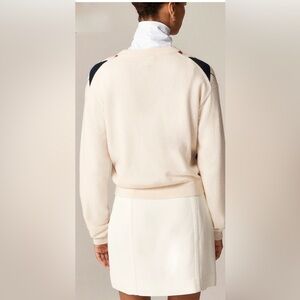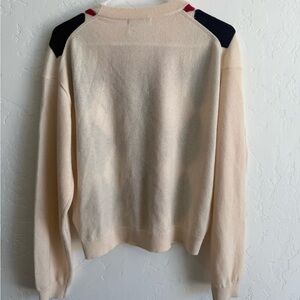 Cream sweater with bold red and navy argyle on the front. Turtleneck style with long sleeves. Clean, classic silhouette for layered looks.