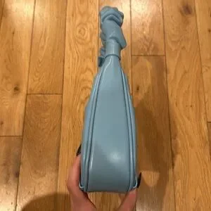 Soft ruched top handle. Smooth faux leather body with gentle pleats. Subtle gold-tone logo accent. Compact, modern silhouette. Versatile everyday style.