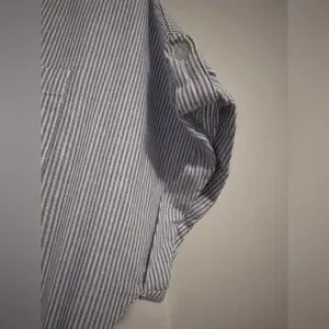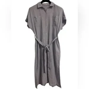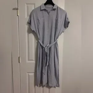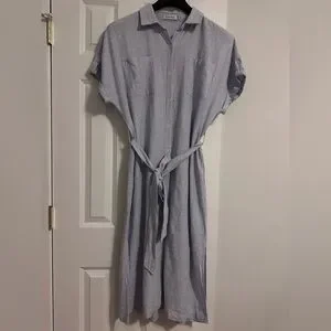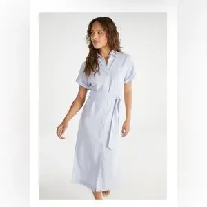 The JustFab Blue and White Shirt Dress is a perfect blend of casual elegance and work-ready style. Featuring a classic dress shirt collar and dolman short sleeves, this midi dress offers a relaxed yet polished look. The light blue and white stripes add a touch of sophistication, making it ideal for both casual outings and professional settings.