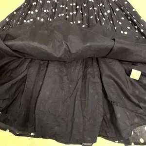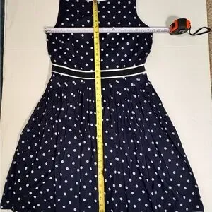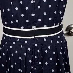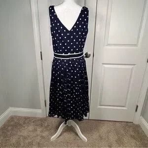 Classic Talbots fit and flare dress in navy blue with a white polka dot print. Made from lightweight cotton with a full cotton lining, this sleeveless dress features a defined waist, swing silhouette, and elegant V-back detail. Perfect for business casual, office wear, brunch, or summer events.