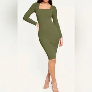 Popilush Olive Green Long Sleeve Bodycon Dress Built-In Shapewear Square Neck L
