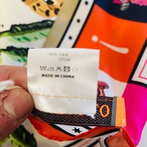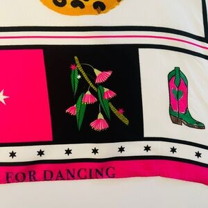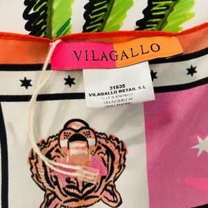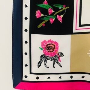NWOT Villa Gallo Bold animal and floral printed silk scarf with vibrant pink panels. Orange trim and accents frame the design. Bright green palm motifs add contrast. Playful star and tiger graphic details. Lightweight and eye-catching accessory.