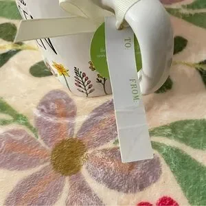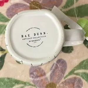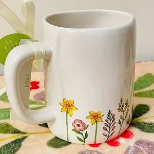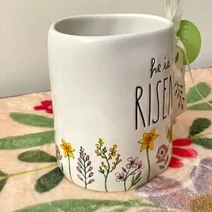 Charming Rae Dunn mug with 'He is Risen' text. Adorned with colorful floral patterns.