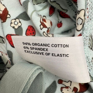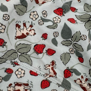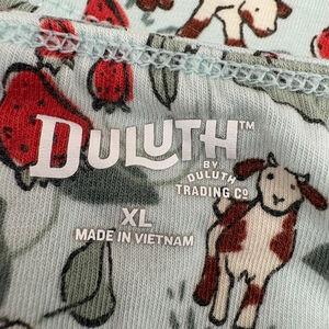 This pre-owned Duluth Trading Co bralette in size XL features a light blue background with a red strawberry and brown and white cow print. It is made from 94% organic cotton and 6% spandex, exclusive of elastic. The bralette has adjustable light blue straps and a soft, unpadded construction. The back shows a simple band with no visible closures, suggesting a pull-on style.