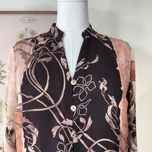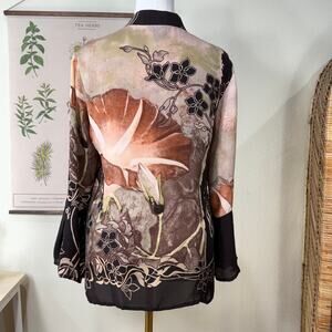 Lightweight, button up, 3/4 flare sleeve, floral, brown/tan/multicolor, silk