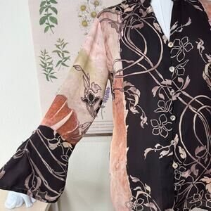 Citron Santa Monica Brown Floral 3/4 Flare Sleeve Silk Top Fairy Grunge Forest M