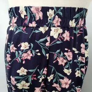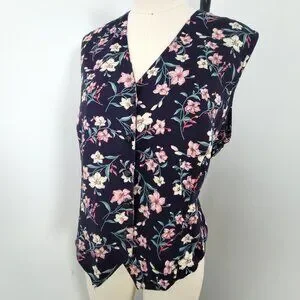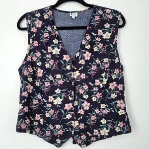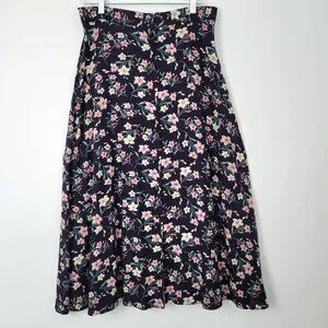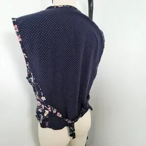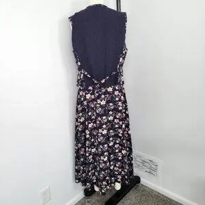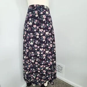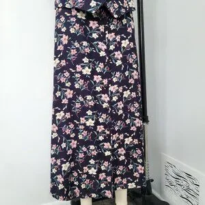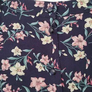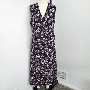 Excellent Condition: Gently preowned, no visible flaws. Matching floral two-piece set featuring a maxi skirt with full front button closure and elastic back for comfort, paired with a coordinating button front vest with tie-back detail for adjustable fit. Navy base with soft pink & cream floral print — classic 90s cottagecore-meets-boho. Fabric feels like lightweight cotton.