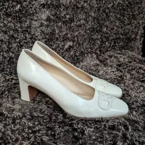 Elegant and timeless, these Salvatore Ferragamo pumps feature a sleek Beige leather design. Salvatore Ferragamo pumps featuring the brand's signature Gancini logo. The Gancini is an iconic, interlocking double-hook emblem that has been a staple of the luxury Italian brand since the 1950s.